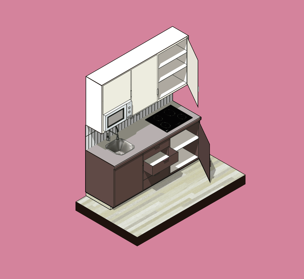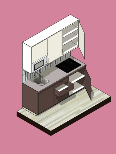 Alacena: Hecha de acero para resistir el guardado de enseres altos y pesados. Diseñada para aludir a un entrepiso más alto y no acumular polvo y/o residuos.